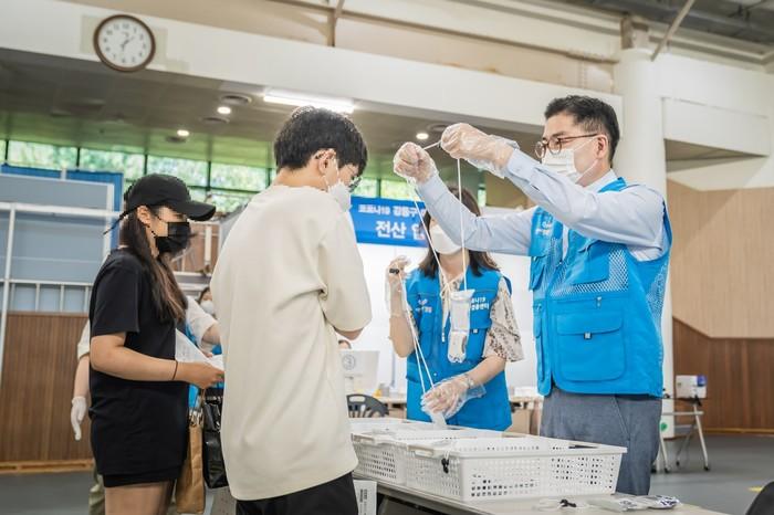 이정훈 강동구청장이 26일 온조대왕문화체육관에 설치된 코로나19 ‘제2예방접종센터’에 방문했다. 이날 이 구청장은 시설을 순회하며 운영상황을 점검하고, 센터 현장근무 직원 등 운영인력에게 격려의 말을 전했다. 사진은 이 구청장(오른쪽)이 백신접종을 한 고등학교 3학년 학생들에게 이상반응관찰 대기시간 설정 타이머를 배부하고 있는 모습. (사진제공=강동구청)
