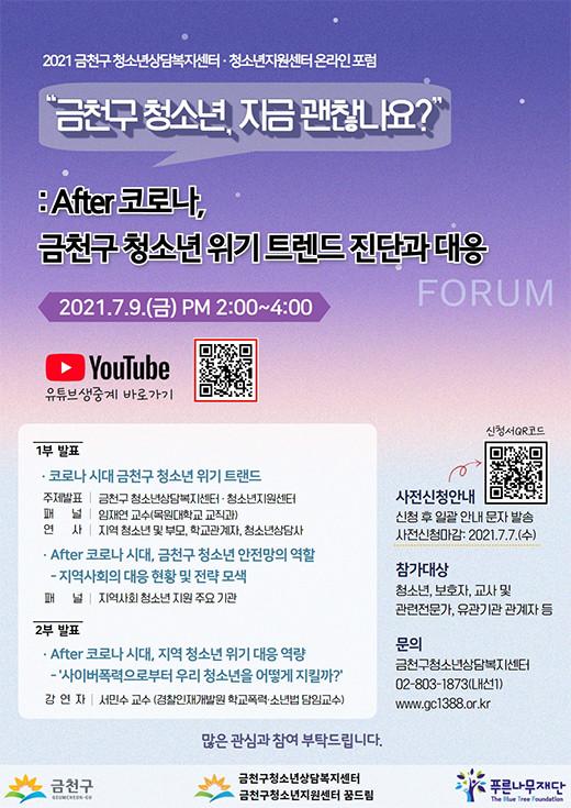 이번 포럼은 유튜브 스트리밍을 통해 실시간으로 진행되며, 1부는 ‘코로나 시대 금천구 청소년 위기 트렌드’ 진단과 ‘After 코로나 시대, 금천구 청소년안전망의 역할’에 대한 논의가 진행될 예정이다.