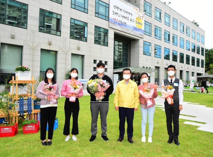서울 중랑구는 가을을 맞이해 중랑행복글판 가을편 문구를 선정하고 23일 중랑구민광장에서 시상식을 개최했다. 사진은 시상식에서 류경기 구청장(오른쪽에서 세 번째)과 수상자들이 기념촬영을 하고 있는 모습. (사진제공=중랑구청)