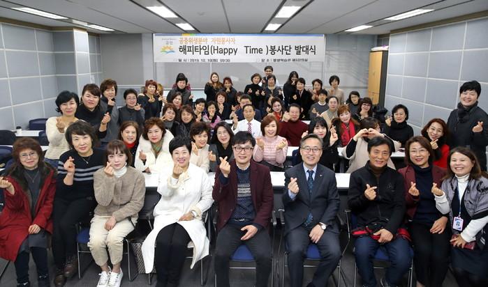 서울 금천구는 지난 10일 평생학습관 제3강의실에서 공중위생 분야 ‘Happy Time 봉사단 발대식’을 개최했다. 사진은 발대식에서 유성훈 구청장(앞줄 오른쪽에서 네 번째)과 공중위생 분야 자원봉사자들이 기념촬영을 하고 있는 모습. (사진제공=금천구청)