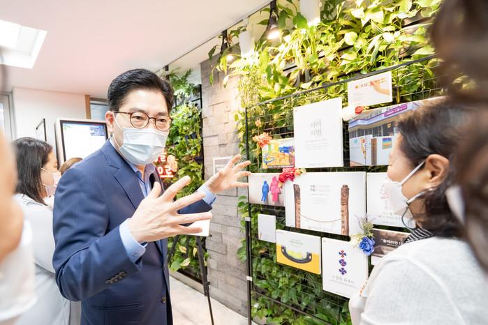 서울 강동구가 지난 2~7일 제2청사 1층 로비에서 ‘제6회 양성평등주간 기념 전람회’를 열었다. ‘양성평등디자인 전국 공모전 수상작’ 등 20여점과 강동구 양성평등 비전을 전시했다. 사진은 전람회 테이프 커팅식에 참석한 이정훈 구청장이 주민과 함께 전시작품을 둘러보고 있는 모습. (사진제공=강동구청)