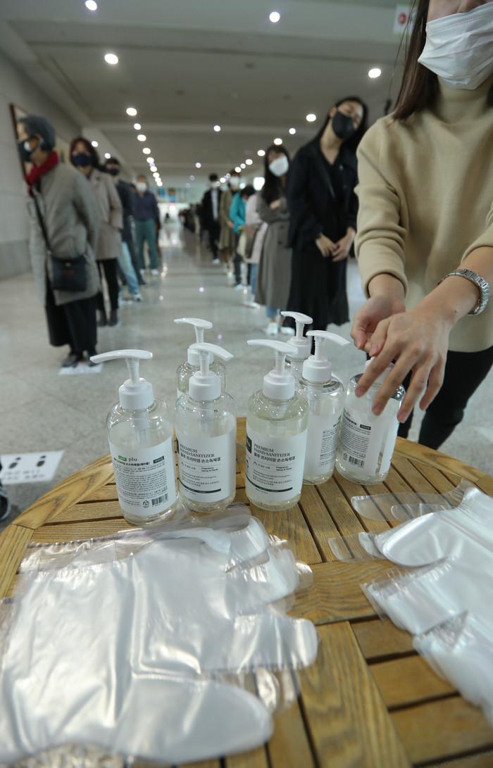 총선 D-5일인 지난 10일 오후 대전시 서구 둔산1동 사전투표소에 유권자들이 길게 줄서 있는 가운데, 순번이 다가온 유권자가 세정제로 손을 씻고 있다.