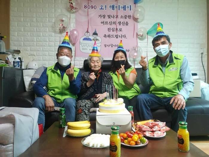 경기 광주시 초월읍 지역사회보장협의체는 3일 지역내 만 80세(팔순)·90세(구순)를 맞이하는 저소득층 홀몸노인을 대상으로 하는 ‘8090 오! 해피데이’ 사업을 추진했다. 사진은 이날 협의체가 쌍동리에 거주하는 대상 노인을 찾아 축하연을 열고 기념촬영을 하는 모습. (사진제공=광주시청)