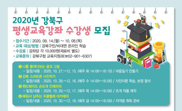 [시민일보 = 홍덕표 기자] 서울 강북구(구청장 박겸수)가 오는 10월부터 구 주민을 대상으로 비대면 평생교육강좌를 운영한다.