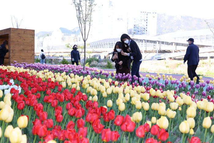 | ▲ 최근 도봉구 중랑천변을 찾은 시민들이 튤립 꽃길을 즐기고 있다. (사진제공=도봉구청) |