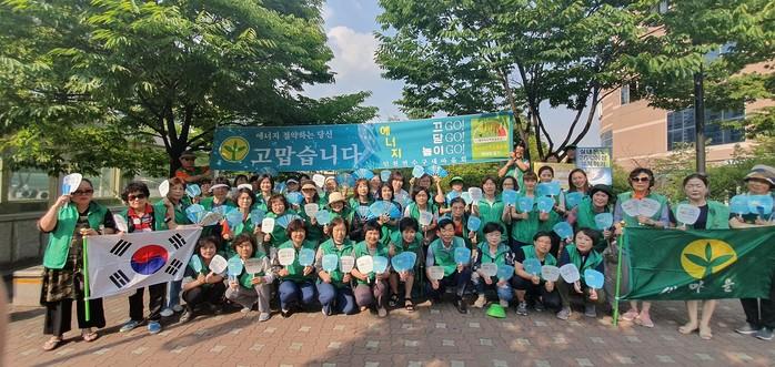 인천 연수구새마을회는 지난 20일 동춘역 일원에서 김예순 부녀회장을 비롯한 남녀새마을지도자 50여명이 참여한 가운데 '2019 하절기 절전 캠페인'을 전개했다. 사진은 캠페인에 참여한 관계자들이 기념촬영을 하는 모습. (사진제공=연수구청)