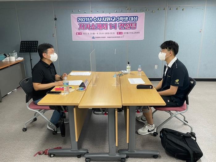 | ▲ 2021년 수시 지원 고3 학생 대상 자기소개소 1대1 컨설팅이 진행되는 모습. (사진제공=인천 미추홀구청) |