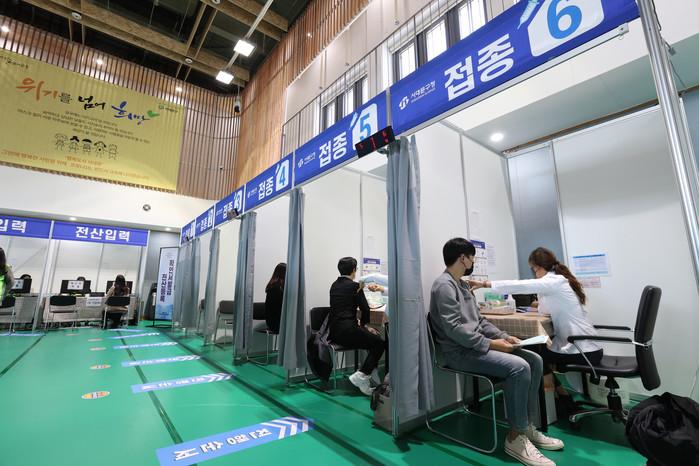 서울 서대문구는 8일 북아현문화체육센터에서 코로나19 백신접종 모의훈련을 실시했다. 사진은 이날 모의훈련이 진행되고 있는 모습. (사진제공=서대문구청)