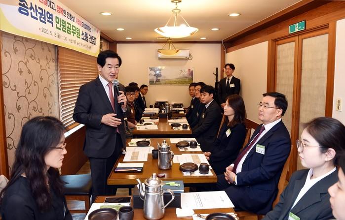 경기 의정부시 송산권역은 15일 송산권역내 민원담당 직원들의 고충 청취 및 민원서비스 향상 방안 마련을 위해 ‘시장과 함께하는 송산권역 민원공무원 소통 간담회’를 개최했다. 사진은 간담회에 참석한 안병용 시장이 발언하는 모습. (사진제공=의정부시청)