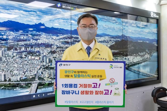 김선갑 서울 광진구청장은 최근 플라스틱을 줄이기 위해 ‘할 수 있는 일 한 가지’와 ‘하지 말아야 할 일 한 가지’를 제안하는 릴레이 캠페인인 ‘탈 플라스틱 고!고! 챌린지’ 시즌2에 동참했다. 사진은 김 구청장이 ‘탈 플라스틱 고!고! 챌린지’ 시즌2에 동참하고 있는 모습. (사진제공=광진구청)