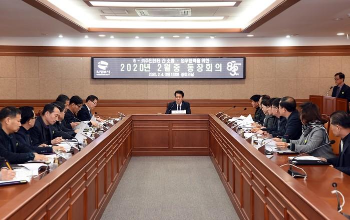 경기 의정부시는 최근 14개동 동장을 대상으로 신종 코로나 바이러스 감염증 확산방지 관련 등 시와 동간의 밀도 있는 소통·협업 행정추진을 위한 동장회의를 개최했다. 황범순 부시장 주재로 진행된 이번 동장회의는 신종 코로나바이러스 감염병에 대한 철저한 대응과 정확한 정보 전달의 중요성을 동장들에게 전달하기 위해 마련했다. 사진은 참여자들이 회의하는 모습. (사진제공=의정부시청)