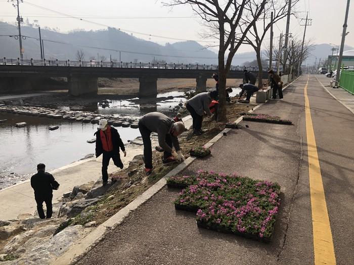 경기 양평군 단월면에서는 최근 봄을 맞이해 단월면레포츠공원 산책로 일대에 꽃잔디 8500본을 정성껏 식재해 생기를 불어넣었다. 사진은 이날 참여한 봉사자들이 꽃잔디를 식재하고 있는 모습. (사진제공=양평군청)