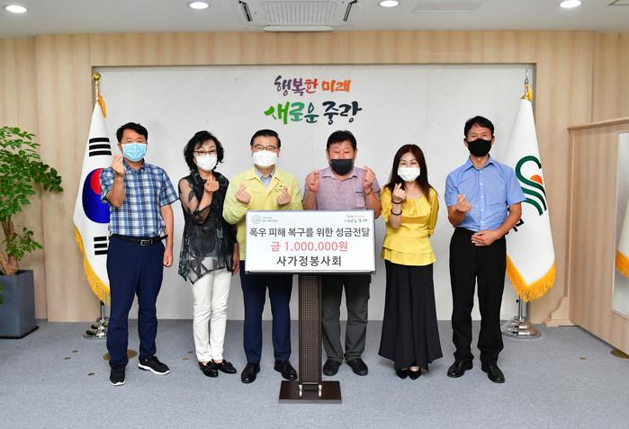 서울 중랑구는 지난 4일 면목7동 봉사단체인 사가정봉사회로부터 지역내 폭우 피해가구를 돕기 위한 성금 100만원을 전달받았다. 사진은 전달식에서 류경기 구청장(왼쪽에서 세 번째)과 관계자들이 기념촬영을 하는 모습. (사진제공=중랑구청)