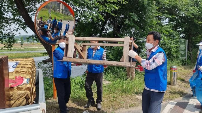 경기 남양주시 다산행정복지센터가 10일 여름 행락철을 맞아 캠핑, 차박, 낚시 등으로 버려진 왕숙천변 불법투기 쓰레기 1톤을 수거하고, 하천변 위험 요소를 점검 및 정비했다. 사진은 이날 봉사자들이 하천변에 버려진 쓰레기를 수거하고 있는 모습. (사진제공=남양주시청)