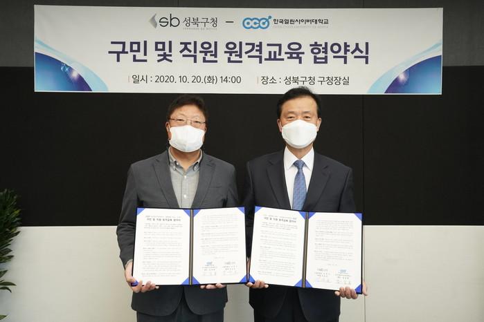 서울 성북구가 20일 한국열린사이버대학교와 구민의 평생교육을 활성화하고 양질의 고등교육 기회 제공을 위해 업무협약을 체결했다. 이 협약을 통해 구민들은 한국열린사이버대에 신규 입학·편입하는 경우 입학금 면제 등의 감면 혜택을 받게 된다. 사진은 협약 체결 후 이승로 구청장(오른쪽)과 장일홍 총장이 기념촬영을 하고 있는 모습. (사진제공=성북구청)