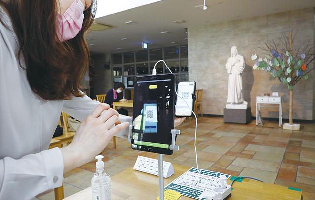 7일 서울 송파구 신천동 성당에서 신도들이 전자출입명부 QR코드로 미사참석 개인정보를 등록하고 있다. 정부는 코로나19 방역을 위해 전자출입명부 시스템을 시범운영하고 있다.