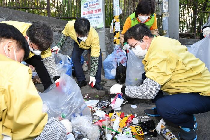 염태영 경기 수원시장은 19일 원천동 일원 쓰레기 무단투기 현장을 점검하고, 동 직원·주민들과 함께 분리 배출되지 않은 재활용쓰레기를 분리하는 작업을 했다. 사진은 염 시장(오른쪽)이 원천동 일원 무단투기 지역에서 쓰레기 분리작업을 하고 있는 모습. (사진제공=수원시청)