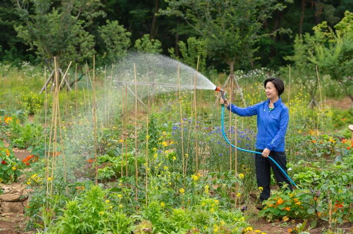 김수영 서울 양천구청장이 지난 19일 양천 도시농업공원(서울 양천구 신월동 산174-1)에서 텃밭에 물을 주고 있다. 양천 도시농업공원은 주민들을 위한 녹지공원으로, 구는 2만4078㎡(7284평)의 부지에 텃밭을 조성해 식용꽃·상추·방울토마토 등 다양한 채소를 길러 푸드마켓뱅크를 통해 취약계층에 기부하고 있다.