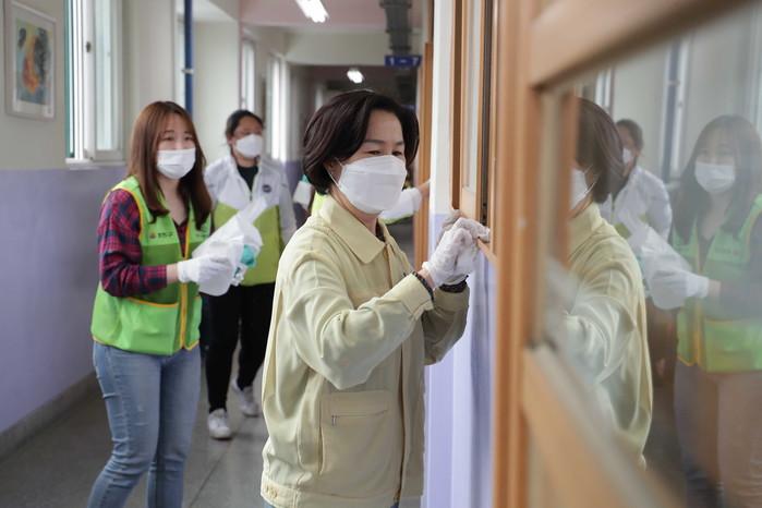 김수영 서울 양천구청장이 구청 공무원, 양천구 학부모협의회, 마을사랑방역봉사단 100여명이 모여 가방(같이해서 가치있는 학교 방역)봉사단을 구성, 등교 개학에 대비해 광영고와 광영여고교실 등 학교시설 등을 청소 및 방역·소독했다. 사진은 광영고등학교 교실을 꼼꼼히 소독·청소하고 있는 김 구청장의 모습. (사진제공=양천구청)