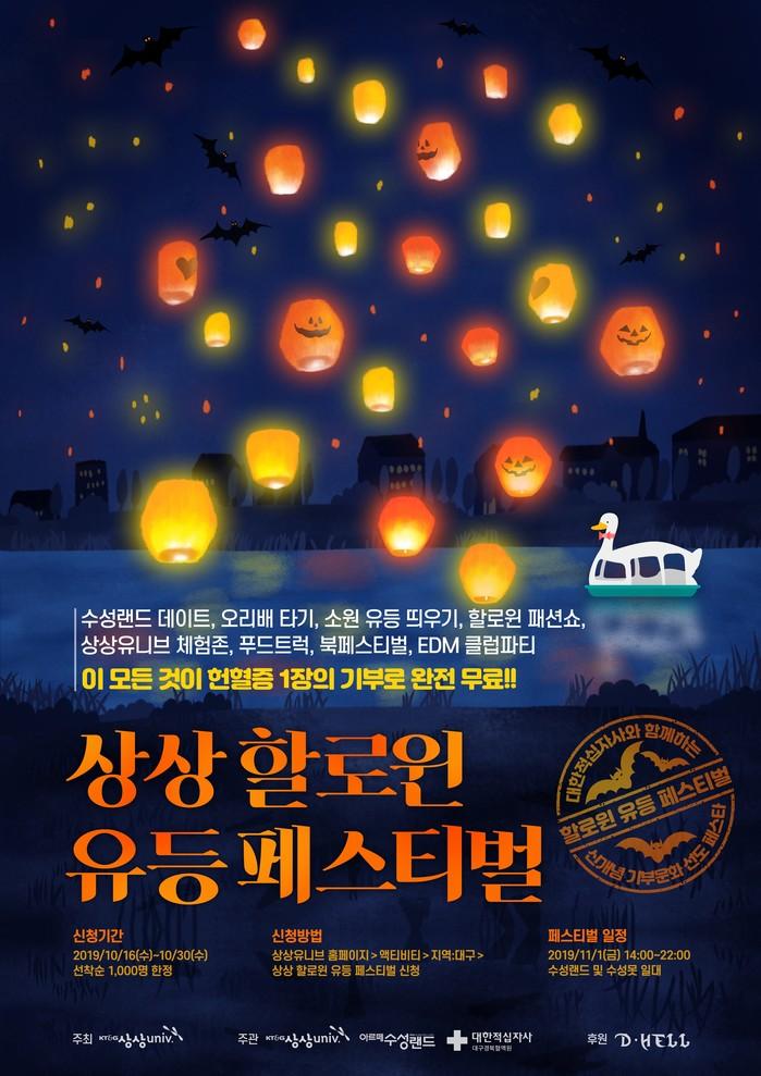 상상유니브가 주최하고 대한적십자사, 아르떼 수성랜드, 파주출판단지, 클럽 디헬 등이 참여하는 이번 행사는 대구지역 대학생 1000여명이 참석한 가운데 소원유등 띄우기, 할로윈 패션쇼, 북페스티벌, 액티비티, EDM클럽파티 등 다채로운 체험부스가 운영된다.