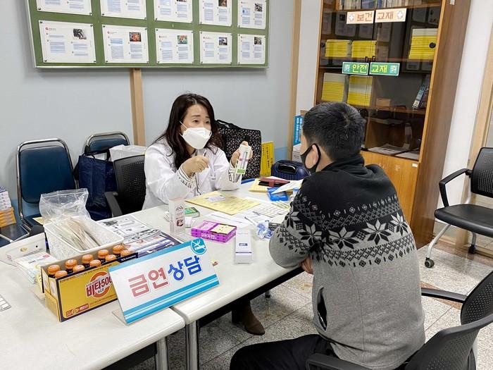 인천 동구가 직장인을 대상으로 ‘사업장으로 찾아가는 금연클리닉’을 운영하고 있다. 찾아가는 금연클리닉은 사업장 금연 희망자를 대상으로 총 6회 운영되며, 금연상담사의 주기적·맞춤형 금연상담 등을 진행하고 있다. 사진은 최근 금연상담사와 1대1 금연상담을 하고 있는 모습. (사진제공=동구청)