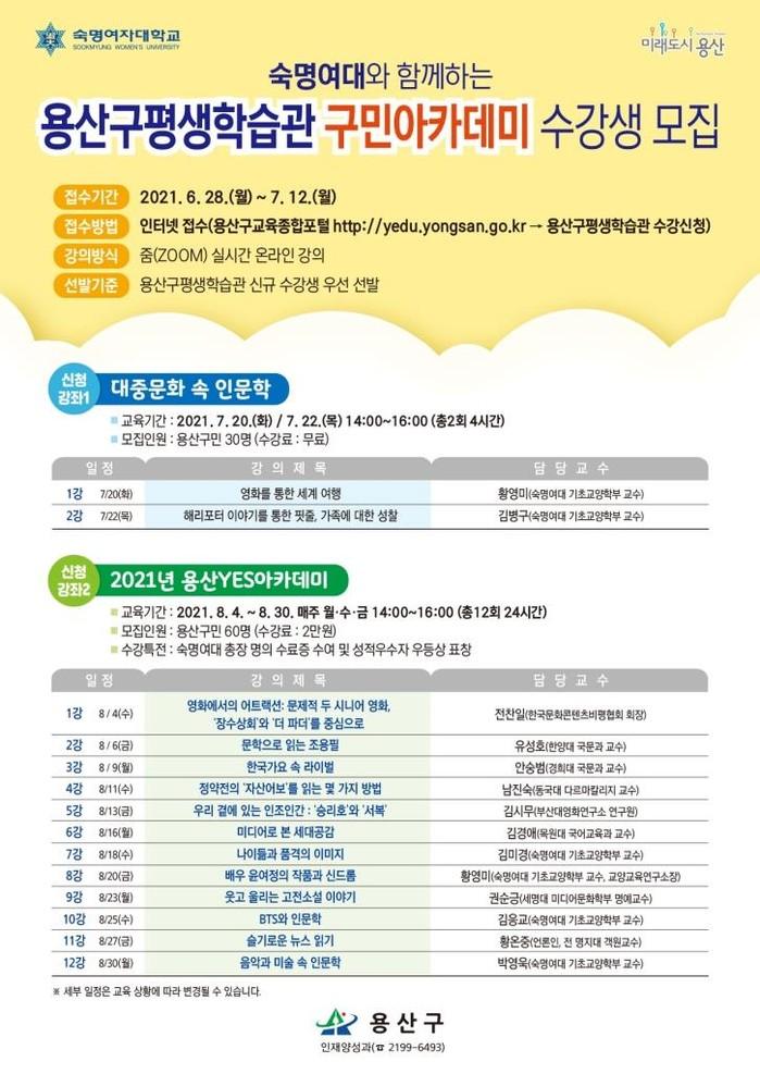 [시민일보 = 홍덕표 기자] 서울 용산구(구청장 성장현)가 숙명여자대학교와 함께 7~8월 용산구평생학습관 구민아카데미 2개 강좌를 운영, 오는 12일까지 수강생을 모집한다.