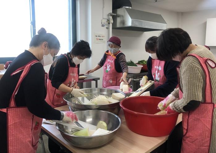경기 수원시 영통구 매탄4동 새마을부녀회는 17일 매탄4동 행정복지센터 3층에 위치한 밥상머리실에서 지역내 어려운 이웃들을 위한 ‘사랑의 반찬나눔’ 행사를 진행했다. 행사 참여자들은 홀몸노인과 장애인등 이웃들에게 봄나물, 불고기 등을 직접 만들어 전달했다. 사진은 참여자들이 음식을 만들고 있는 모습. (사진제공=영통구청)