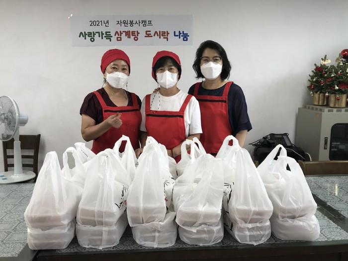 광진구 광장동 주민센터는 최근 자원봉사캠프 주관으로 삼계탕 도시락과 밑반찬을 직접 조리해 지난 여름 무더위로 지친 지역내 저소득 취약계층 25가구에 전달했다. 사진은 전달식에서 봉사자들이 기념촬영을 하는 모습. (사진제공=광진구청)