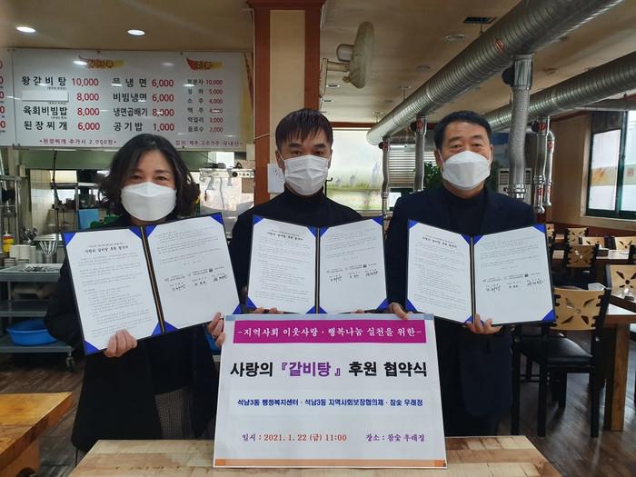 인천 서구 석남3동 행정복지센터가 최근 지역내 '참숯 우래정', 지역사회보장협의체와 건강과 행복 나눔 갈비탕 후원협약을 체결했다. 이날 협약에 따라 참숯 우래정은 매월 갈비탕 10그릇씩(10가구)을 저소득 홀몸노인 및 장애인 가구에 후원한다. 사진은 협약식에서 관계자들이 기념촬영을 하는 모습. (사진제공=서구청)