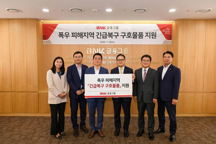 | ▲ BNK금융그룹이 지난 29일 오후, 폭우 피해를 입은 지역민을 위한 긴급복구 구호물품 전달식을 가졌다.(사진제공=BNK금융그룹) |