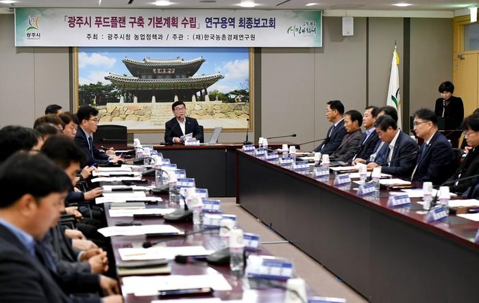 경기 광주시가 13일 시청에서 신동헌 시장과 먹거리정책 연계 부서장 및 농협중앙회 광주시지부장 등 31명이 참석한 가운데 '광주시 푸드플랜(먹거리 전략) 구축 기본계획 수립' 연구용역 최종보고회를 개최했다. 사진은 회의 진행 모습. (사진제공=광주시청)