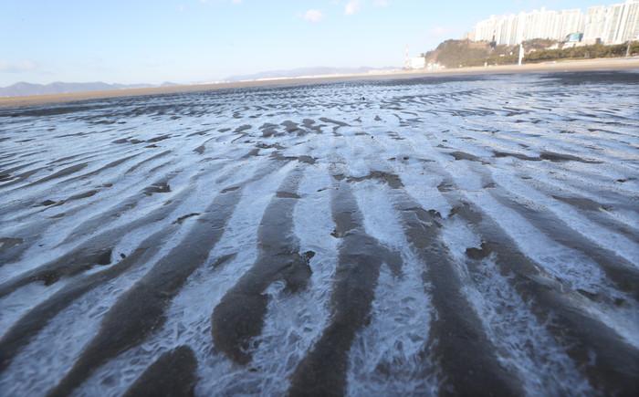 전국에 강력한 한파가 덮친 7일 오전 부산 사하구 다대포해수욕장 모래톱 사이로 고인 바닷물이 얼어 있다.