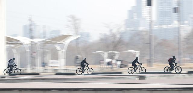 전국적으로 포근한 봄 날씨를 보인 21일 오전 시민들이 자전거를 타고 잠수교를 지나고 있다.