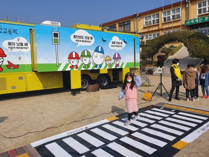 경기 여주시 문장초등학교는 25일 재학생을 대상으로 특수차량을 이용해 교통사고 위기대처 능력을 향상하는 안전체험교육 ‘차차’ 프로그램을 운영했다. 사진은 이날 학생들이 횡단보도 안전체험을 하고 있는 모습. (사진제공=여주교육지원청)