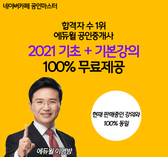 에듀윌 공인중개사와 단독 제휴를 통해 공인마스터 네이버카페에서 특별히 제공하는 무료인강은 2021년 공인중개사 시험 대비 유료인강으로 네이버카페 ‘공인마스터’에 회원가입만 하면 누구나 올해 시험일까지 무료로 수강할 수 있다.