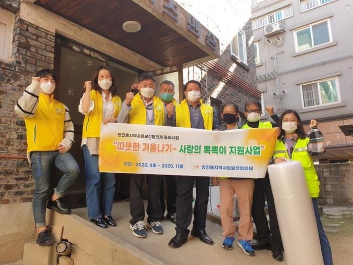 경기 이천시 창전동지역사회보장협의체는 20일 지역내 주거 취약계층 30가구에 추운 겨울을 대비해 에어캡 단열재를 부착했다. 사랑의 뽁뽁이 지원사업은 복지사각지대 발굴사업의 일환으로 창전동 행복마을 지킴이와 협업하고 있다. 사진은 참여자들이 기념촬영을 하고 있는 모습. (사진제공=이천시청)