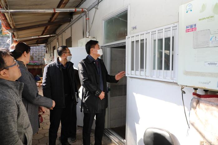 경기 수원시 권선구가 지난 10일 평동 쪽방촌을 방문해 신종 코로나바이러스 감염증 대비 손 소독제 5개와 마스크 150개를 전달하고 손 씻기 등 전염병 예방을 당부했다. 사진은 길영배 구청장(오른쪽)과 관계자들이 쪽방촌을 둘러보는 모습. (사진제공=권선구청)