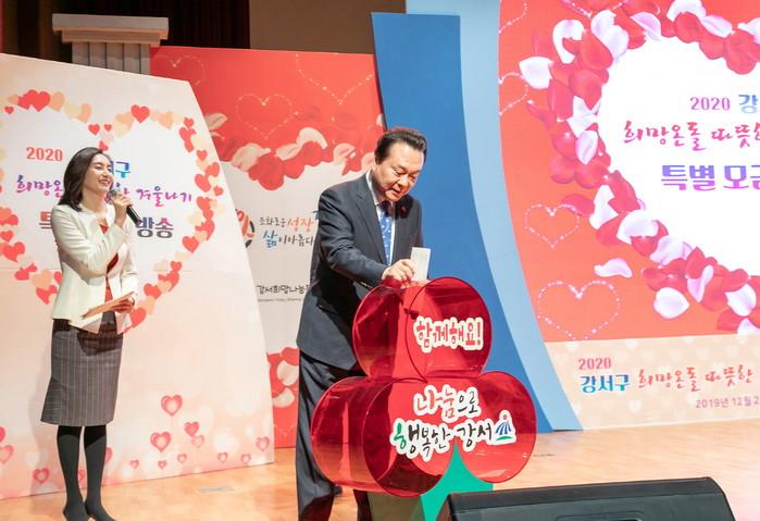 강서구가 서울사회복지공동모금회와 손잡고 최근 구민회관에서 지역사회 기부문화 확산을 위한 ‘2020 희망온돌 따뜻한 겨울나기 특별모금방송’을 했다. 사진은 생방송 현장에 방문한 구민들이 줄을 서며 성금을 넣고 있는 모습. (사진제공=강서구청)