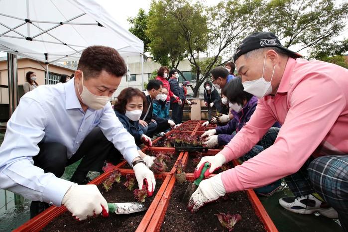 인천 동구 송림2동 행정복지센터는 최근 동 행정복지센터 옥상 유휴공간을 나눔 텃밭으로 조성하기 위한 ‘옥상 나눔 텃밭’ 모종심기 행사를 열었다. 사진은 이날 참여한 허인환 구청장(왼쪽)과 주민들이 화분에 채소 모종을 심고 있는 모습. (사진제공=동구청)
