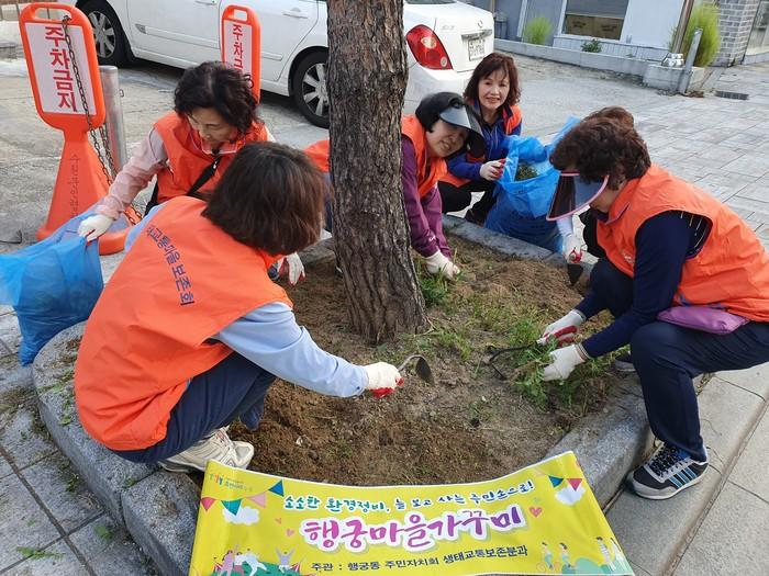 지난 28일 경기 수원시 팔달구 행궁동 환경가꾸기 봉사단 ‘행궁마을가꾸미’가 활동 첫 삽을 떴다. 매월 둘째·넷째 토요일 새벽, 행궁동 주민자치회의 생태교통보존분과위원회 회원들을 포함한 행궁동 주민 13명이 마을의 정원과 화단을 정비한다. 사진은 참여자들이 잡초를 제거하는 모습. (사진제공=팔달구청)
