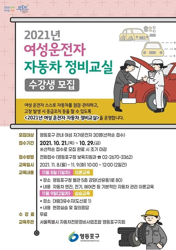 [시민일보 = 여영준 기자] 서울 영등포구(구청장 채현일)는 '여성 운전자를 위한 자동차 정비교실'에 참가할 구민을 오는 29일까지 모집한다고 26일 밝혔다.