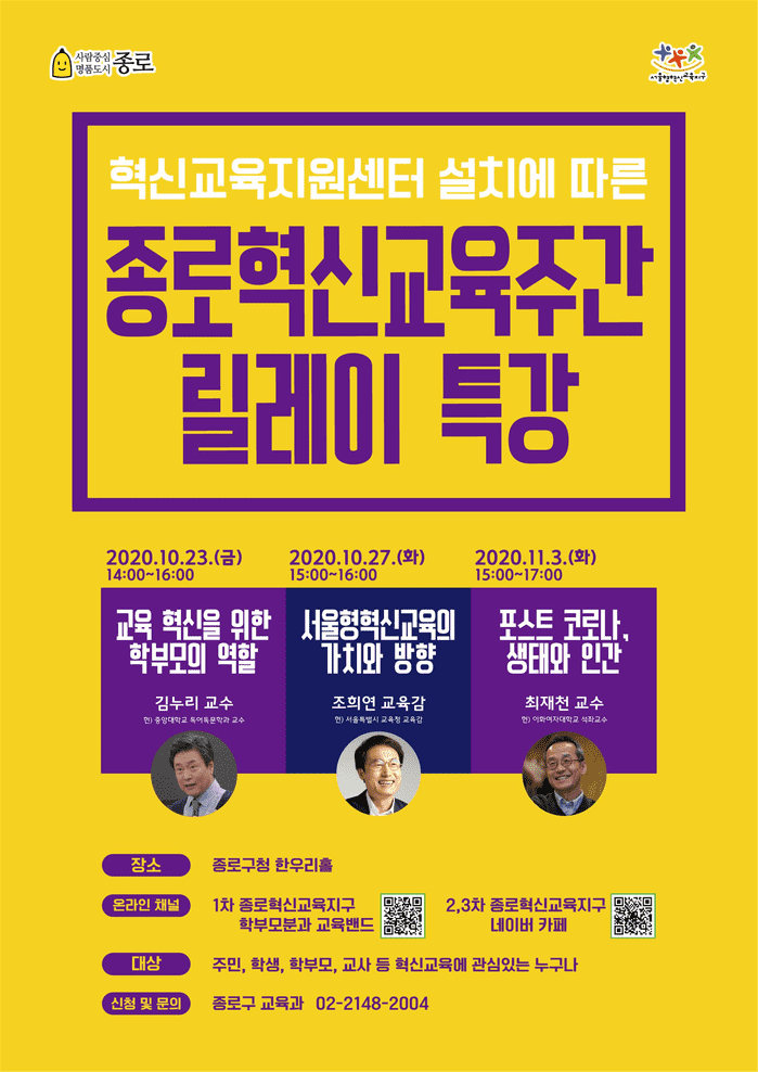 먼저 명사 초청 릴레이 특강은 구청 한우리홀에서 ‘코로나19 이후 미래 교육 방향 및 삶의 태도’라는 주제로 총 세 번에 걸쳐 열린다.