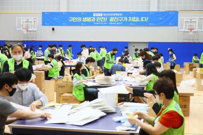 광진구가 코로나19 장기화로 취소된 5월 가정의 달 행사를 대신해 기념일별 대상자에게 축하메시지를 담은 서한문과 마스크를 전달한다. 구는 어린이날을 비롯해 어버이 날(8일), 스승의 날(15일), 성년의 날(18일), 부부의 날(21일) 등 각 5개의 기념 일자에 맞춰 서한문과 마스크 총 60만5000매 전달에 나선다. 사진은 지난 4일 자양체육관에서 가정의 달 맞이 마스크를 포장하고 있는 행복일자리 참여자 및 직원들 모습. (사진제공=광진구청)
