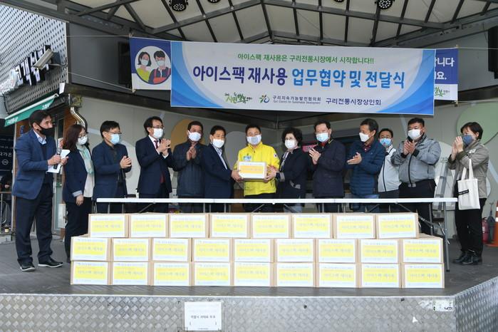 경기 구리시 지속가능발전협의회가 22일 구리전통시장에서 아이스팩 재사용으로 쓰레기 감량과 자원순환 운동을 실천하기 위해 '아이스팩 재사용 사업을 위한 업무 협약'을 체결했다. 사진은 협약식에서 전통시장 상인회에 1200개의 재사용 아이스팩을 전달하며 안승남 시장(가운데)과 관계자들이 기념촬영을 하는 모습. (사진제공=구리시청)
