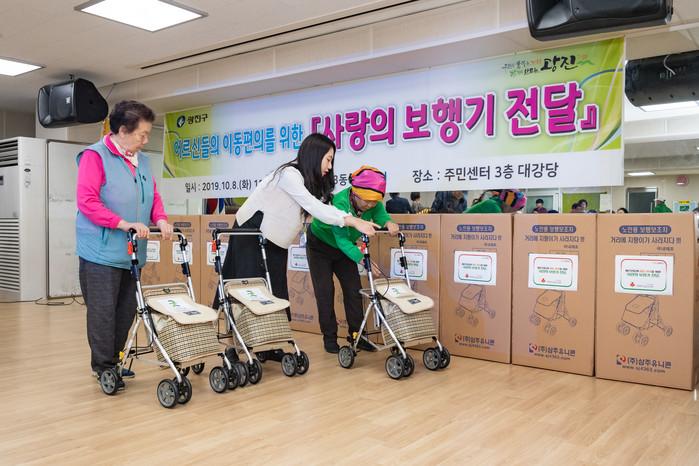 서울 광진구 자양3동 주민센터가 지난 8일 '제23회 노인의 날'을 맞아 거동이 불편한 저소득층 노인 30명에게 성인용 보행기를 전달했다. 사진은 ‘사랑의 보행기 전달식’에서 동주민센터 관계자가 노인들에게 보행기 사용법을 안내하고 있는 모습. (사진제공=광진구청)