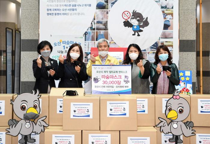 경기 오산시는 지역내 전체 어린이집 257곳, 유치원 47곳 총 1만5000여명의 아동들에게 1인당 2매씩 시에서 직접 제작한 필터교체형 ‘따숨마스크’ 3만장을 무상 지급하기로 했다. 사진은 곽상욱 시장(가운데)과 관계자들이 함께 기념촬영을 하는 모습. (사진제공=오산시청)