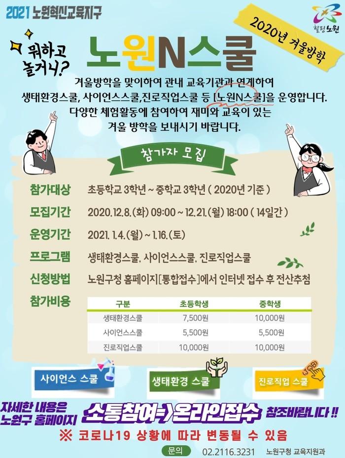 [시민일보 = 홍덕표 기자] 서울 노원구(구청장 오승록)가 다가오는 겨울방학을 다양한 체험활동으로 알차게 보낼 수 있도록 '노원N스쿨'을 운영한다고 17일 밝혔다.