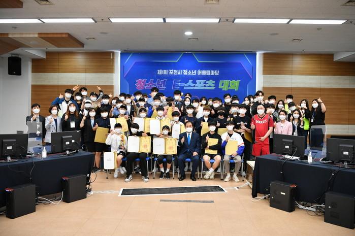 경기 포천시가 최근 ‘2021년 제1회 포천시 청소년 어울림마당 청소년 E-스포츠 게임대회’를 성황리에 마쳤다. 이번 대회에서는 총 10개 학교·31팀·148명의 청소년이 참가했으며 1부 리그 오브 레전드, 2부 카트라이더 대회가 진행됐다. 사진은 박윤국 시장(앞줄 가운데)와 참가자들이 기념촬영을 하는 모습. (사진제공=포천시청)