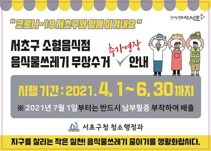 [시민일보 = 이대우 기자] 서울 서초구(구청장 조은희)가 오는 6월 말까지 소형음식점 음식물쓰레기 무상 수거기간을 연장한다.