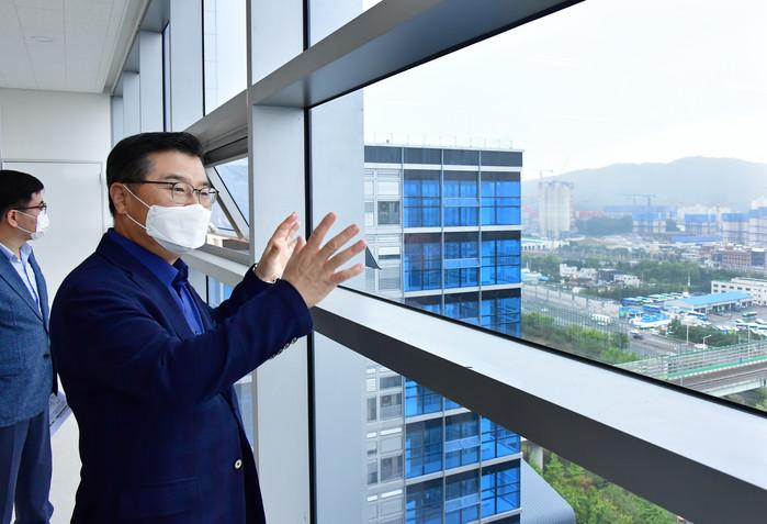 류경기 서울 중랑구청장이 지난 25일 지식산업1센터 신내데시앙플렉스를 방문했다. 사진은 이날 류 구청장이 입주를 앞둔 신내데시앙플렉스의 주요 시설을 둘러보고 있는 모습. (사진제공=중랑구청)